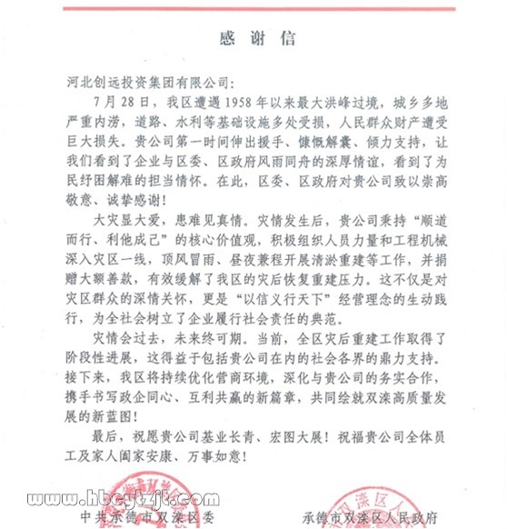 近日,承德市雙灤區(qū)區(qū)委、區(qū)政府向河北創(chuàng)遠(yuǎn)投資集團(tuán)發(fā)來感謝信,對創(chuàng)遠(yuǎn)集團(tuán)在今年抗洪搶險(xiǎn)期間第一時(shí)間伸出援手、與區(qū)委、區(qū)政府和當(dāng)?shù)厝罕婏L(fēng)雨同舟的深厚情誼,表達(dá)了誠摯的感謝。